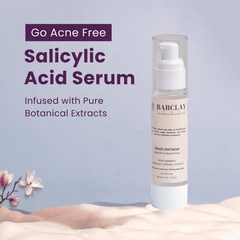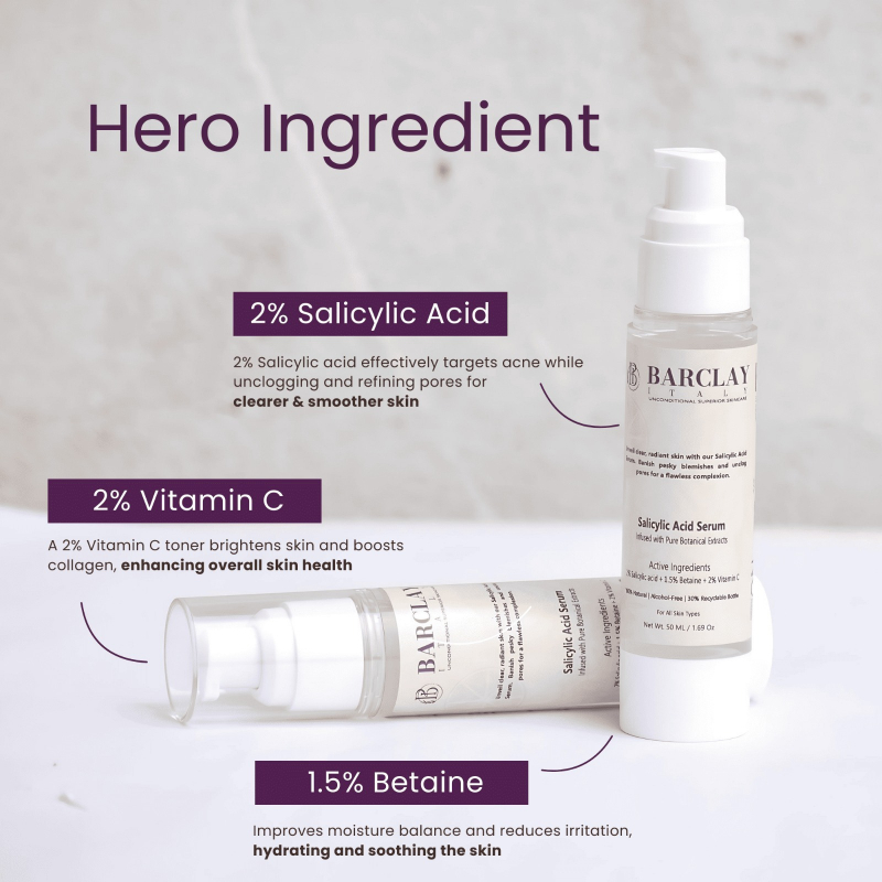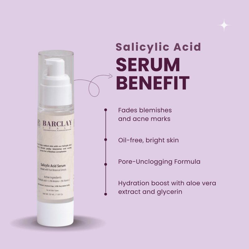 Barclay Italy 2% Salicylic Acid Serum targets acne, reduces dark spots, and brightens skin with 2% Vitamin C. Alcohol-free, natural formula in a luxurious airless bottle for optimal freshness