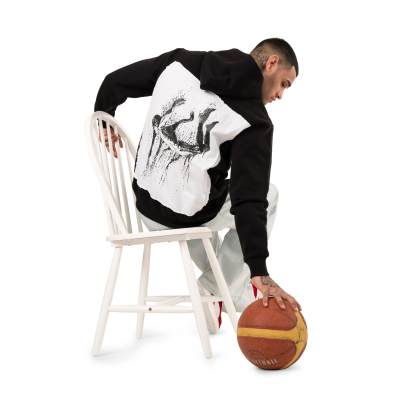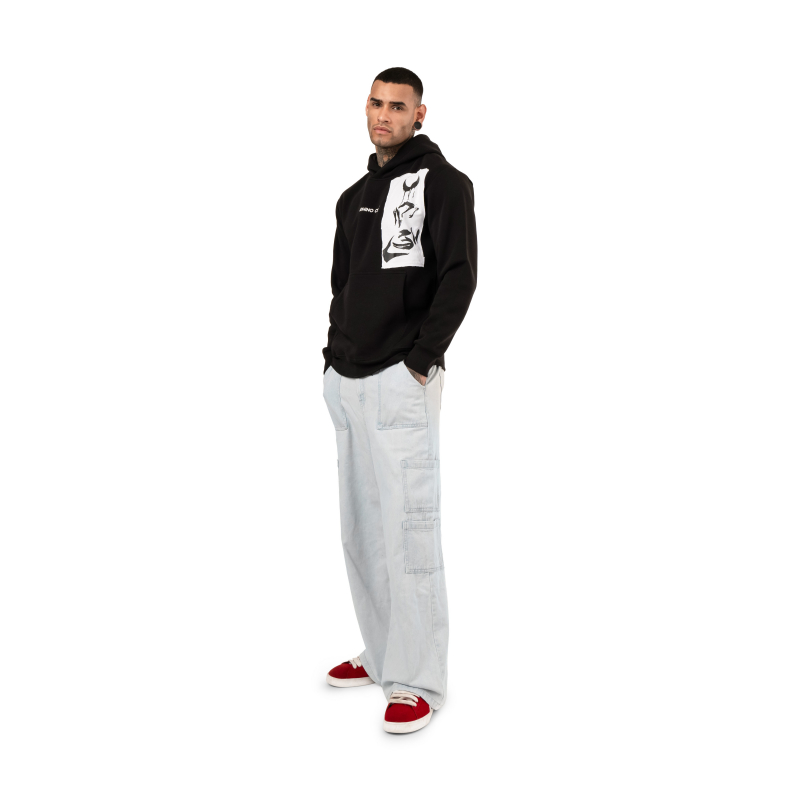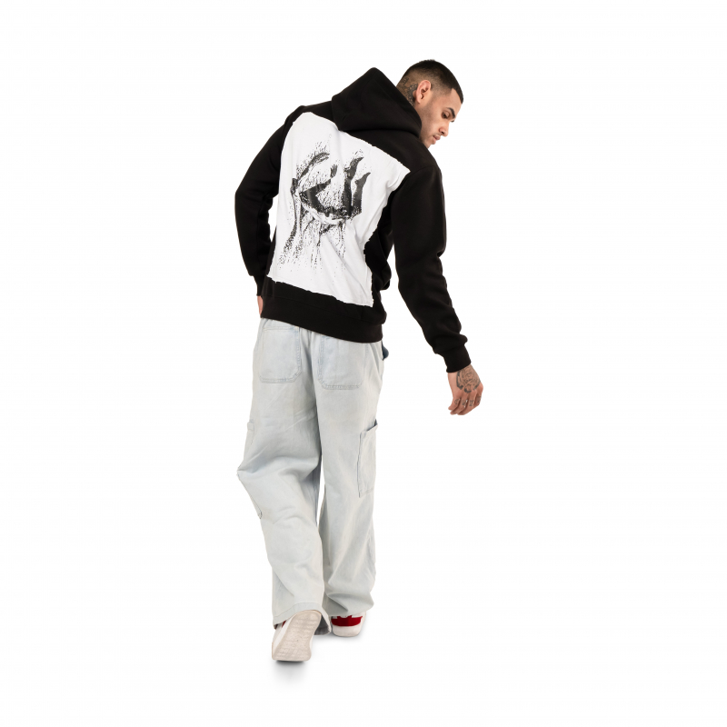 Keywords: black hoodie, premium hoodie, falling man design, patchwork hoodie, comfortable hoodie, stylish hoodie, polycotton, fashion, clothing.