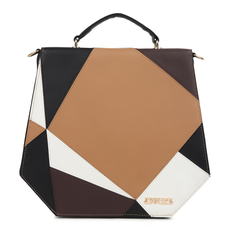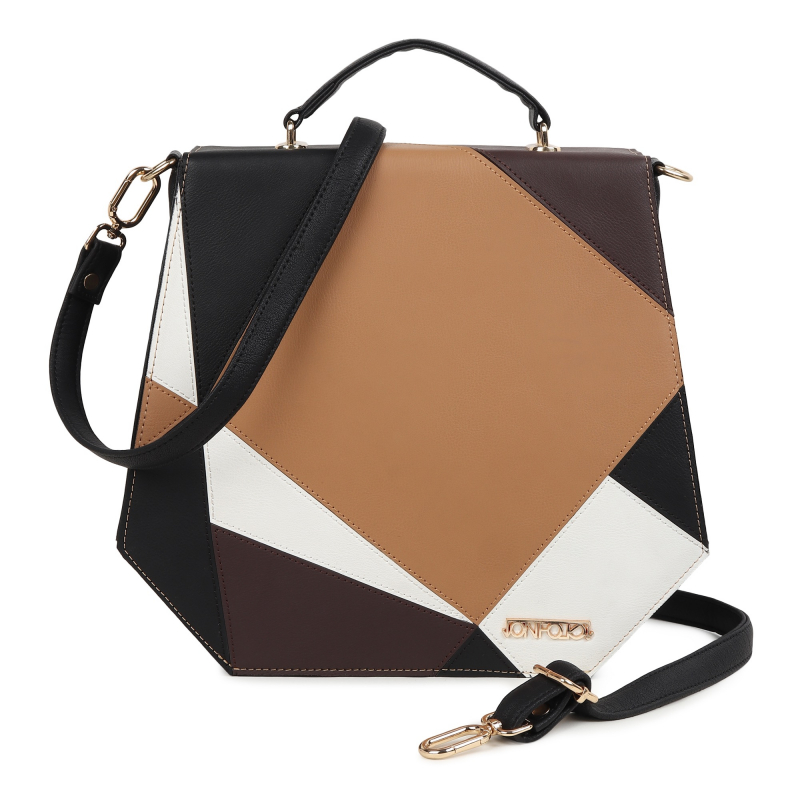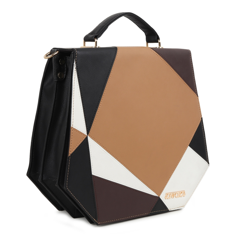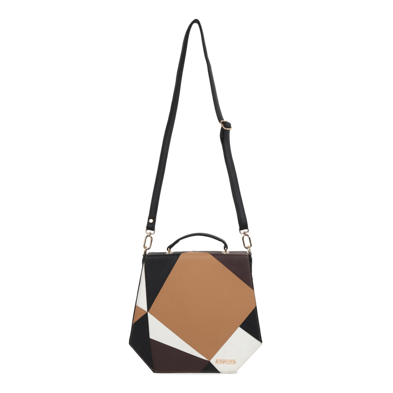 Introducing the "Prism" - a chic and versatile handbag designed for seamless day-to-night transitions. Crafted in a refined trapezium silhouette, the elongated flap showcases a delightful mix of neutral tones - black, beige, brown, and white - while the main body exudes sophistication in classic black.
